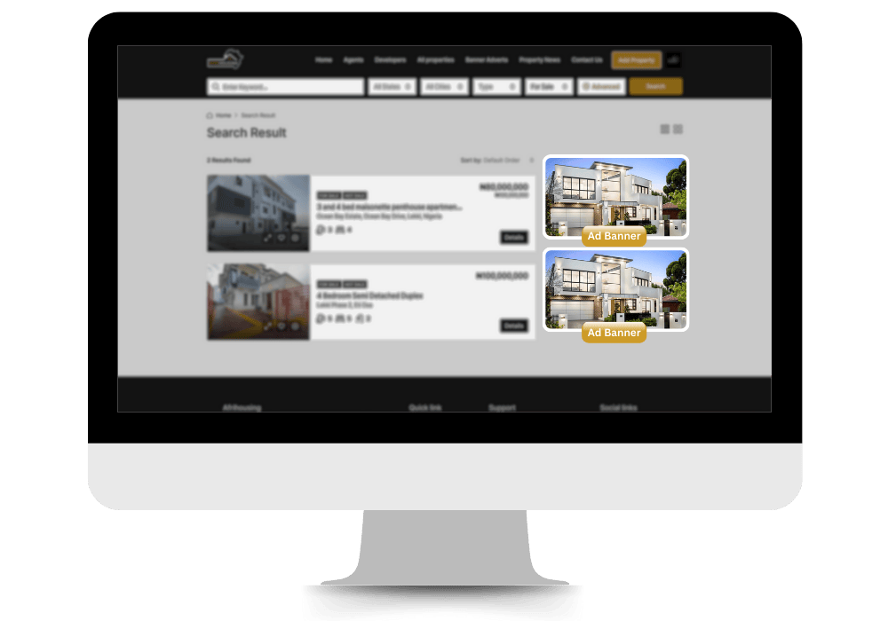 Your banner will appear on the sidebar of the search results page when users look for properties on the website. This increases the chance of getting noticed and turning views into actions. There are only 5 slots available, and each ad gets one banner.